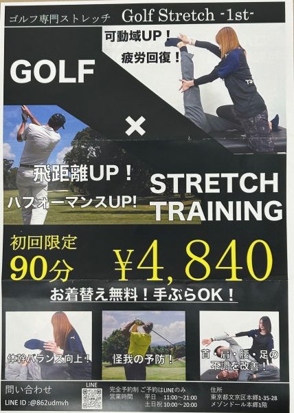 当スクールの生徒様が経営しているストレッチ専門店にゴルフ専門のストレッチ店がオープンしたとの事で、早速お邪魔してきました!!兎に角、身体が硬いのでトレーナーさんも苦笑い(;^_^A ただ、今の私の身体の状態ですと、筋トレより柔軟性優先でまだまだ改善の余地はあるとのお言葉を頂きました。 とにかく地道な努力が出来ない私ですが、トレーナーさんにすべてお任せしていれば柔らかくなるので頑張って通いたいと思います。興味のある方は是非一度体験しみてくださいね。